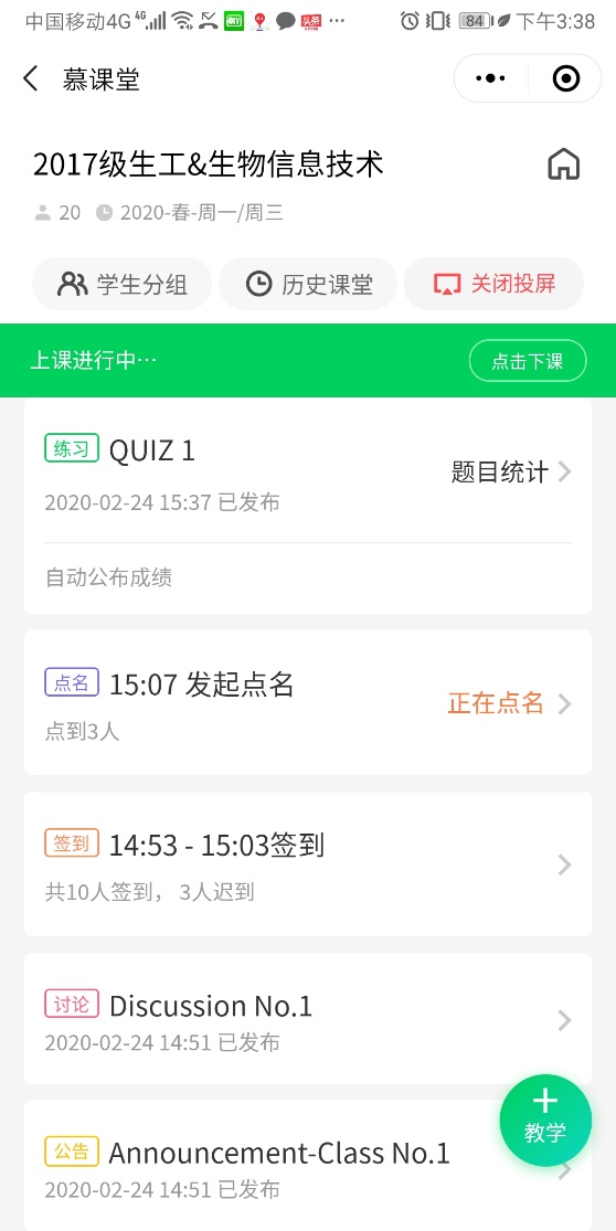 在线教学的互动流畅性很难满足全英文课程的授课需要,《生物信息技术》就遇到这个难题。任课教师金垚副教授通过调整教学方案,利用自建的慕课资源并辅�QQ群开展授课,通过对课件进行“仪式感”设计,依托“滴入式”的知识点灌输和随机点名互动,引导学生摆脱虚拟空间的束缚,时刻保持与课堂教学同等的学习专注度。学生对这种授课模式的调整普遍反响热烈�