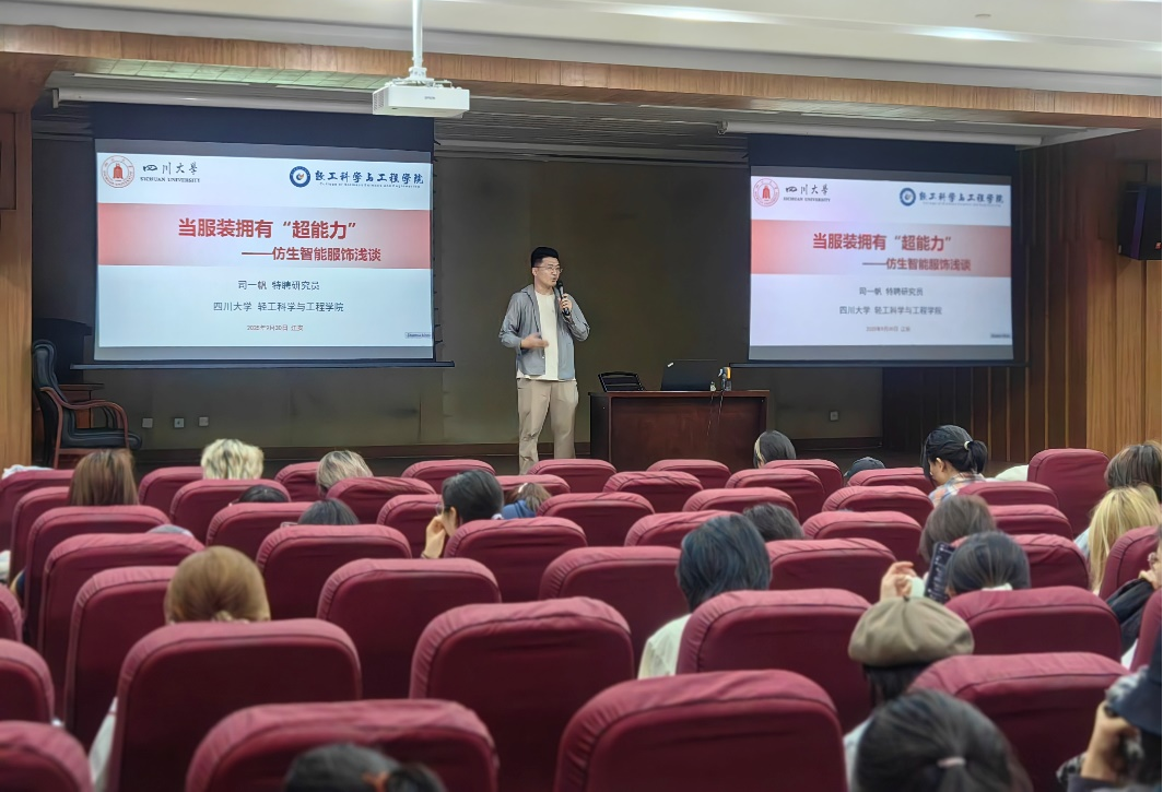 司一帆老师以“荷叶效应”为例,深入浅出地讲解了功能材料的研究原理与实际应用。在现场互动中,他将普通纸巾变为防水纸巾的实验赢得了同学们的阵阵掌声,激发了大家对功能面料的浓厚兴趣。
