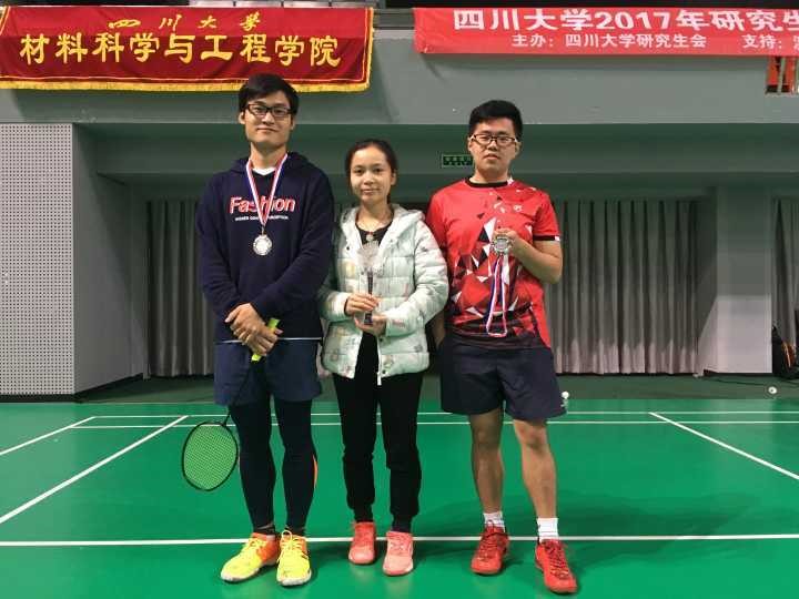 2017研究生阳光体育羽毛球联赛在望江校区风雨羽毛球场顺利举行。我院研究生羽毛球队以团体总成绩第一喜获佳绩,获得本次团体冠军,其中我院混双组合叶勤文和文嘉婷同学夺得第二名优异成绩,男单贾欣驹同学夺得第二名优异成绩,邓莎老师进入教师组前八名。