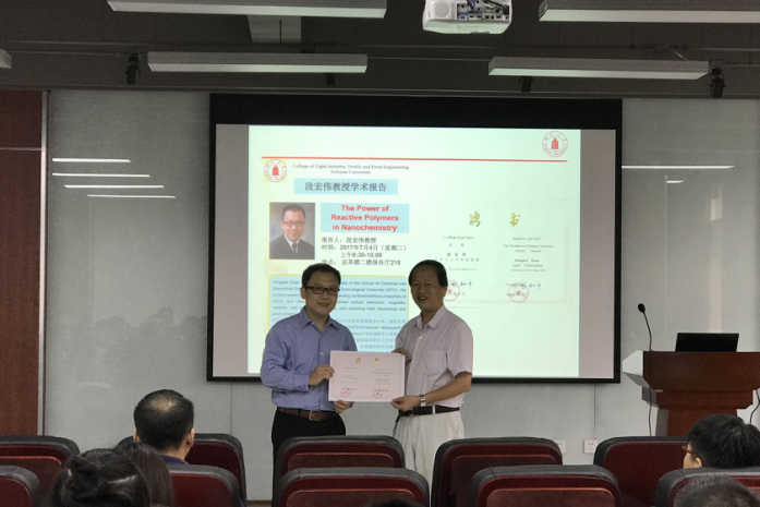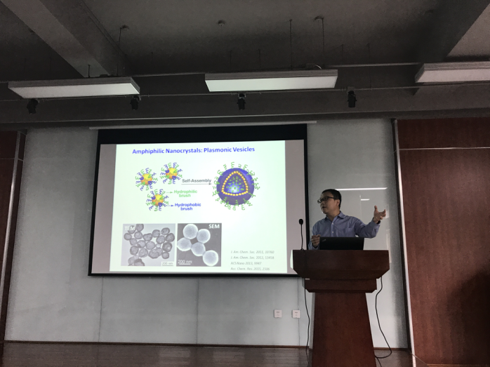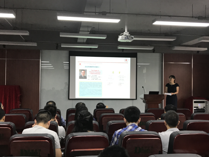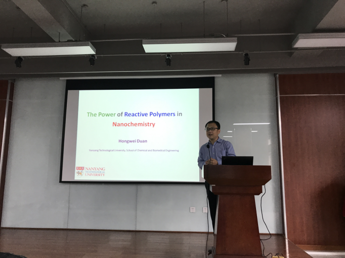 2017年7月4日,来自新加坡南洋理工大学化学与生物医学工程学院的段宏伟副教授对我院进行学术交流访问,并在皮革楼二楼报告厅做了学术报告会,报告会由我院林炜教授主持。段宏伟副教授在会上作了一场题为“The Power of Reactive Polymers in Nanochemistry”的学术报告,介绍了其主要的研究方向和最新的研究成果。该会不仅有我校大量教师、研究生、本科生参加,还吸引了部分校外的学者们前来交流讨论。最后,大家带着思考和收获,以热烈掌声感谢段宏伟副教授的精彩学术报告,报告会在轻松活跃的气氛中落下帷幕。段宏伟教授本科和硕士分别就读于复旦大学化学系和高分子系,师从江明院士。他于2005年在马克思普朗克胶体界面研究所Helmuth Möhwald教授研究组完成博士论文,之后在佐治亚理工和Emory大学生物医学工程系和聂书明教授从事博士后研究。他在2009年加入新加坡南洋理工大学化学与生物医学工程学院,并于2015年晋升终身副教授。2017年被聘为91自拍