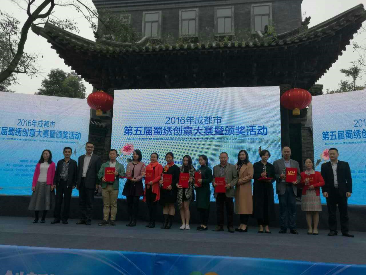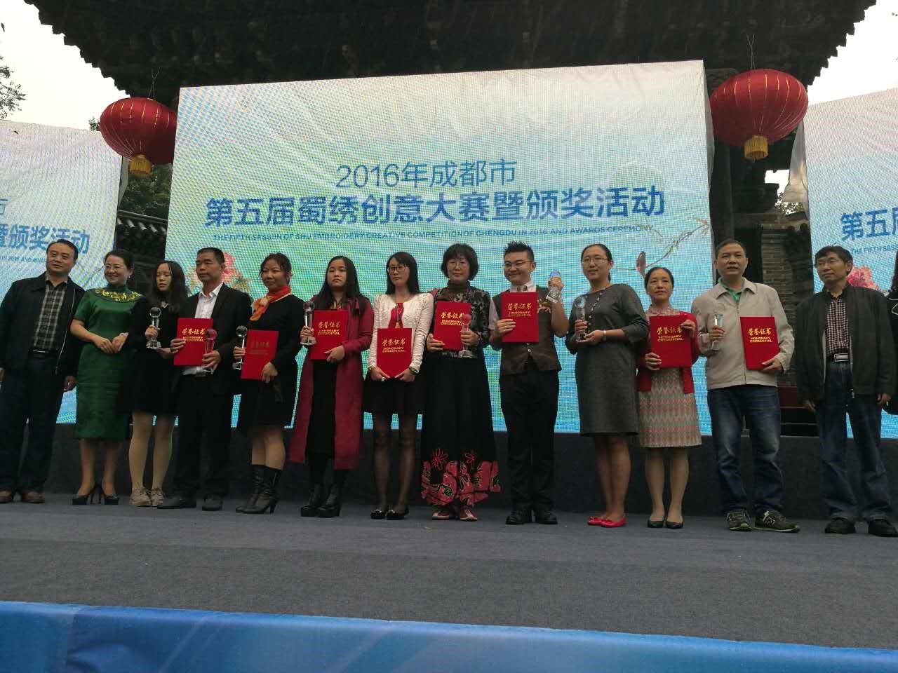 10月18日,在一片秋雨朦胧中,由四川省妇女联合会指导、成都市妇女联合会主办的全国“大众创业万众创新”活动周系列活动——第五届蜀绣创意大赛暨颁奖典礼于成都大邑县幸福公社落下帷幕,我院蜀绣蜀锦设计研发课题组参赛师生与蜀绣大师和蜀绣参赛企业们同台竞争,由赵敏、吴起宏、李梓君、王维杰设计的蜀绣装饰画稿“朝晖”、蜀绣包包“新·生”分别获得了银奖和铜奖。