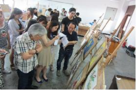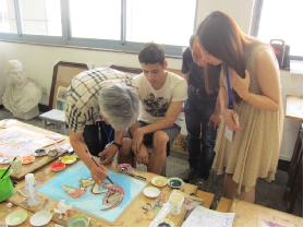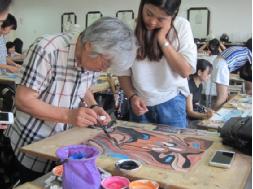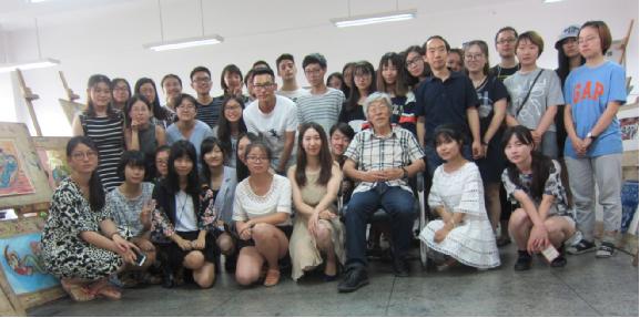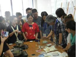 在教学过程中,竹原教授采用统一示范和逐个指导的授课方式,与学生互动其中,为每一个本科生的个人创作进行指导和提出修改意见。在课堂绘画中,竹原教授更注重同学们的想象和创造能力,以及对绘画过程的一丝不苟的匠人精神。课余时间里,竹原教授与同学们更是亲切交流,用他多年的绘画经验和见识回答疑惑问题,课堂氛围积极融洽。经过两周紧张的艺术创作,同学们纷纷交出了满意的作品,竹原教授更是依次的评讲,对大家的绘画成果赞赏不绝。最后大家合影留念,圆满的结束了此次学习实践。通过这次“实践与国际课程周”活动,我院学生对日本绘画与材料有了更进一步的认识和理解,在教授的示范指导和自身的绘画体验下,同学们对日本画材料产生了浓厚的兴趣。本次的实践学习不仅可以提高同学们自身的绘画专业素质和能力,在一定程度上大大提高了同学们的创作能力与不同材料综合应用能力,扩充了专业技能,也为今后的专业学习打下扎实的基础。
