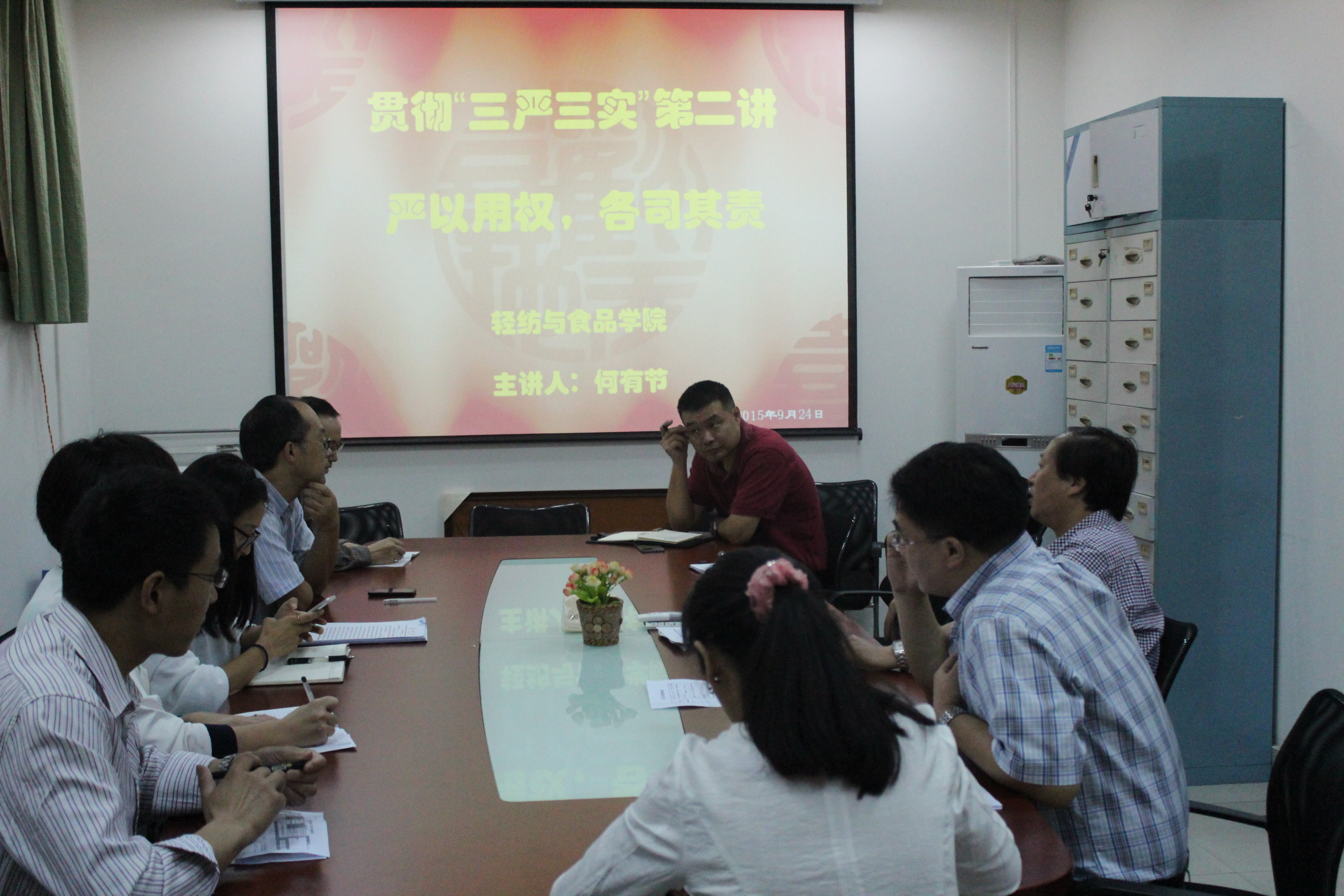 9月24日上午,我院在纺工副楼201会议室举行“三严三实”第二讲“严以用权”专题讲座。本次讲座由院长何有节教授主讲。学院中层领导干部、院长助理、科级干部、教职工党支部书记和学生党支部书记参加此次讲座。何院长以“严以用权、各司其职”为题,从个人对“严以用权”的理解,自身存在问题的分析和整改思路三个方面作报告。报告深入浅出、剖析深刻,与会人员结合自身工作谈了谈学习这个专题的感触。通过本次讲座,与会人员都表示对本专题有了更深入的体会和理解。