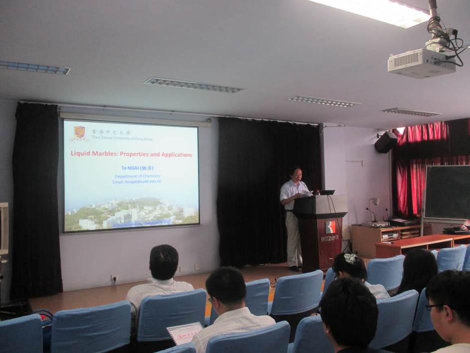 轻纺与食品学院邀请,香港中文大学化学系魏涛教授于2015年7月1日在我院访问,并在皮革楼2楼学术报告厅为我院师生作了一场题为“Liquid Marbles: Properties and Applications”的学术报告。报告会由轻纺与食品学院院长何有节教授致欢迎辞,生物质与皮革工程系副系主任林炜教授主持。魏涛教授在报告中对Liquid Marbles的制备原理与方法、独特性质及其作为微型反应器在不同领域的用途等方面的研究工作及最新进展做了详细的介绍。魏涛教授的报告紧抓国际学术前沿研究,内容新颖,讲解深入浅出、思路清晰,激起了聆听报告师生的浓厚兴趣。报告结束后,魏涛教授与学院部分师生进行了交流和讨论。魏涛教授于2003年获香港中文大学化学系化学博士学位,2003年-2005年在德国巴斯夫公司任职,2005年7-12月在美国明尼苏达大学做博士后研究,2006年1月起在香港中文大学化学系任教。目前主要研究领域包括:高分子、胶体粒子和软物质的设计和合成及其相互作用研究等。魏涛教授近年在Angewandte Chemie International Edition、Chemical Communications、Macromolecules、Soft Matter和Langmuir等国际核心学术刊物发表论文80余篇。