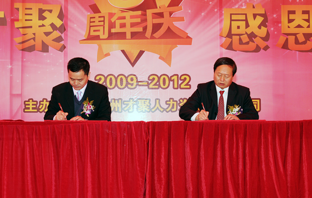 2012年12月1日,在广州狮岭,91自拍 轻纺与食品学院与广州才聚人力资源有限公司签订了“产学研”合作协议,建立合作交流关系。我院何有节院长、广州才聚人力资源有限公司熊金红总经理代表双方在协议上签字。