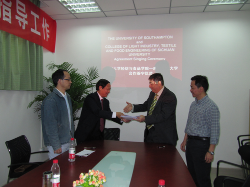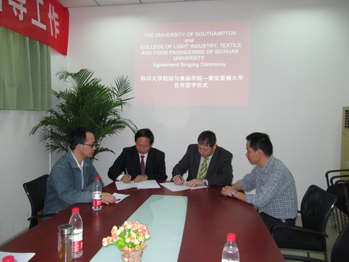 轻纺与食品学院与英国南安普敦大学(The Southampton University)联合培养人才的合作协议在我院正式签署,该合作协议的签署标志着我院在人才培养的国际间交流与合作方面取得了重要进展。我院主管本科教学副院长何强教授、纺织与服装系服装教研室主任张皋鹏副教授参加了签字仪式。