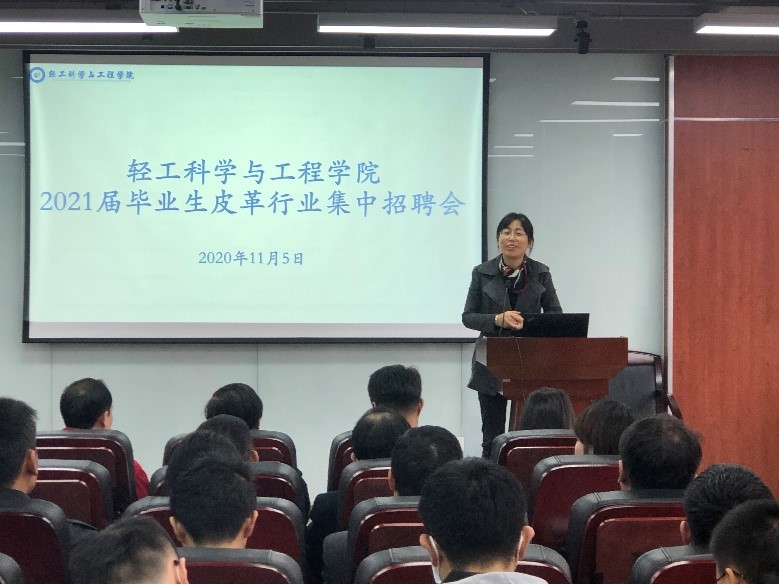 首先,冯老师介绍了参会企业与学院嘉宾、2021届轻化工程及服装与服饰设计专业学生的基本情况,同时阐明了举办本次集中招聘会的目的,即为我院毕业生提供就业机会,加强学校与企业的交流与合作,同时也增进皮革产业链各企业的交流,共同为学校人才培养提供平台。