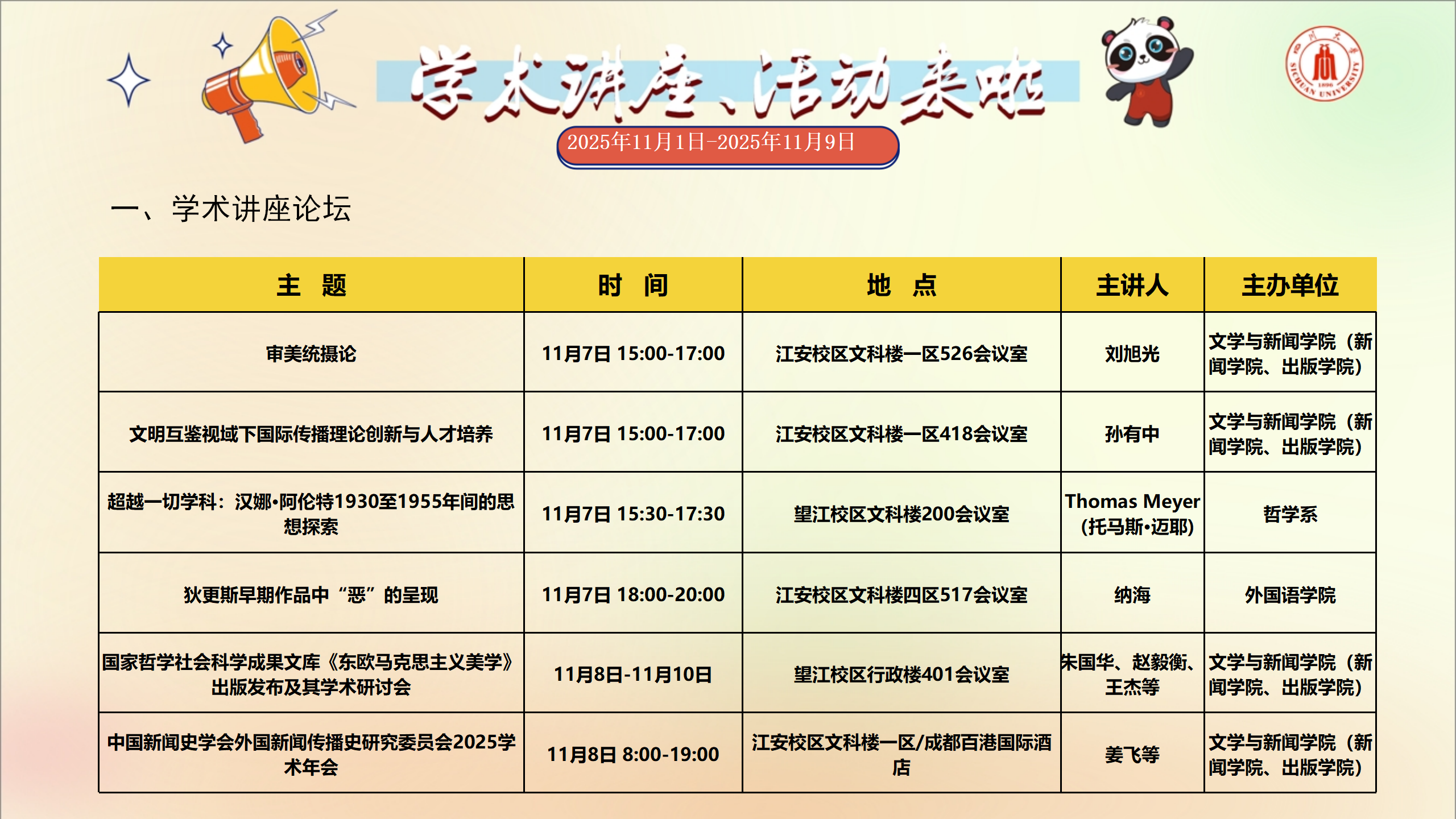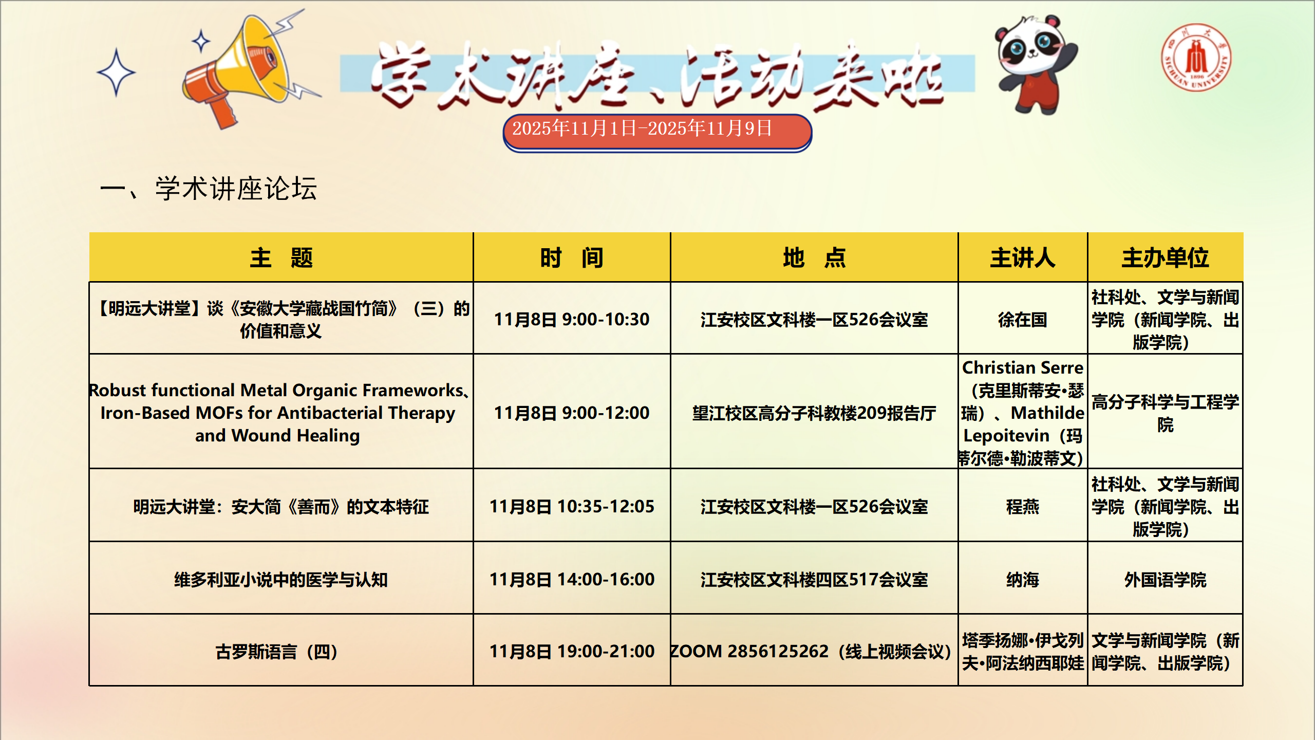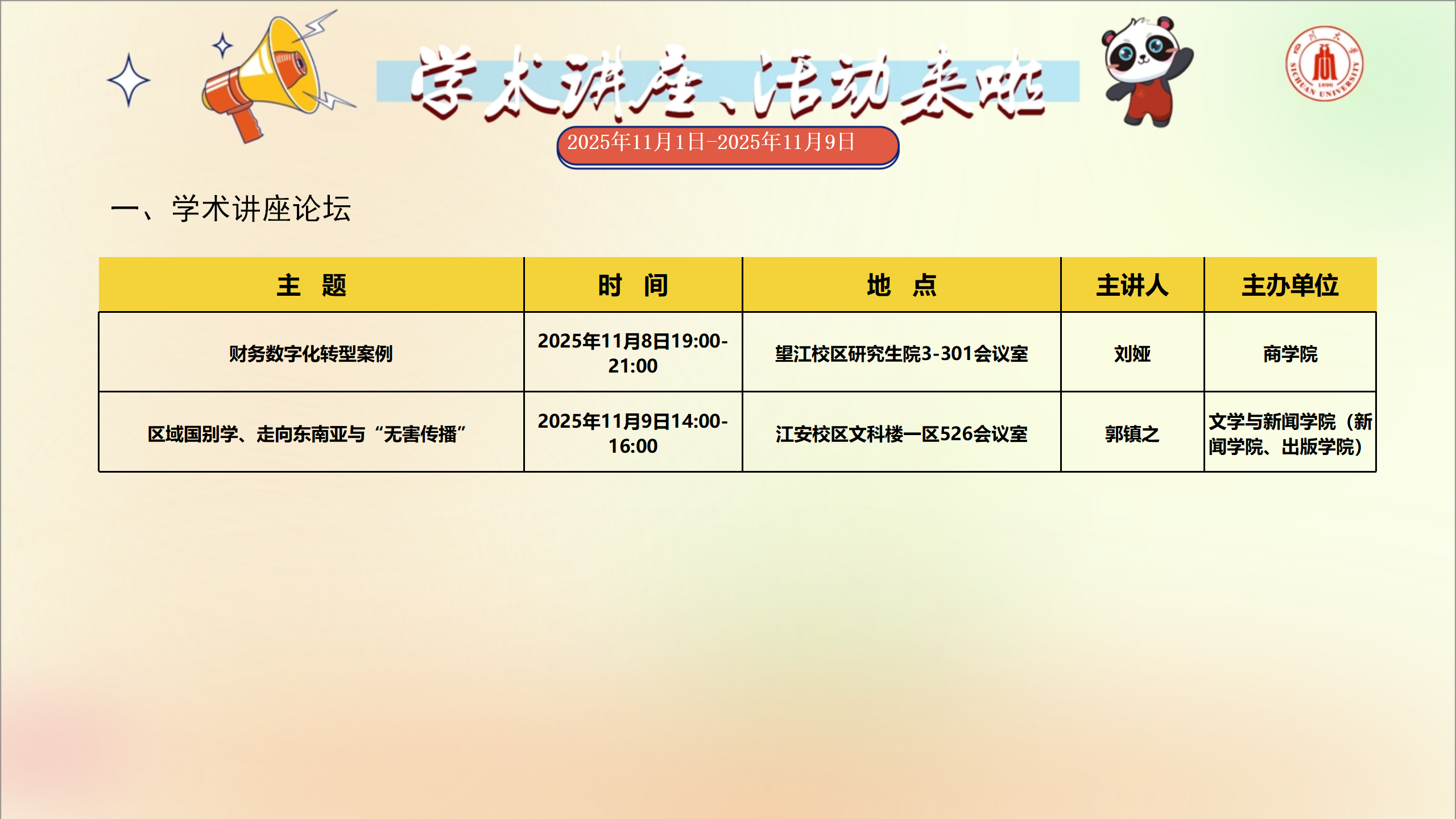 学术讲座和校园文化活动预告(2025年11月1日-2025年11月9日)