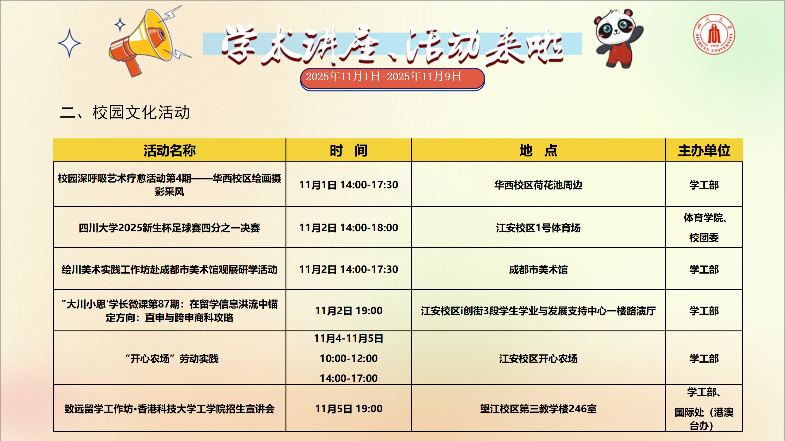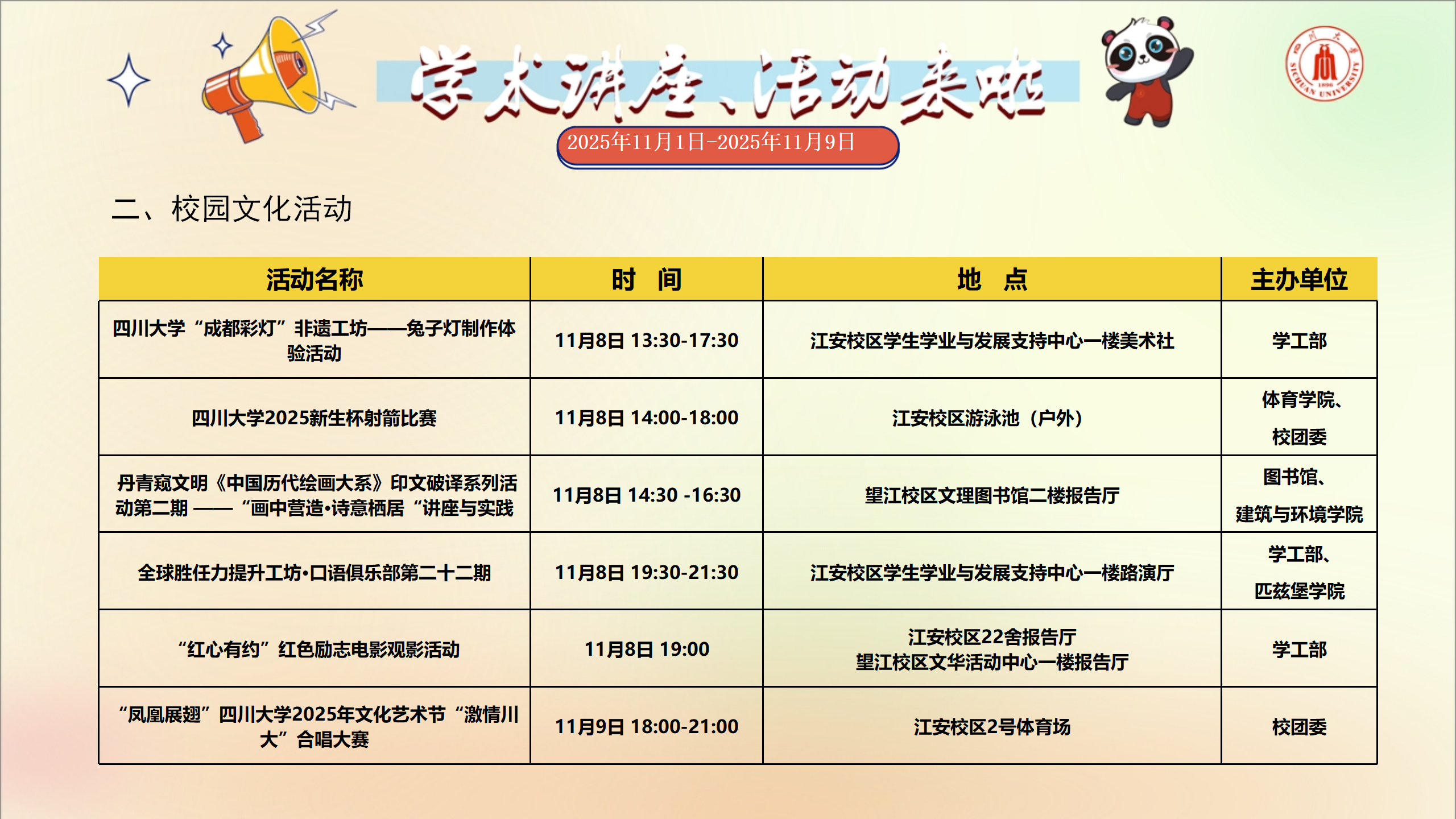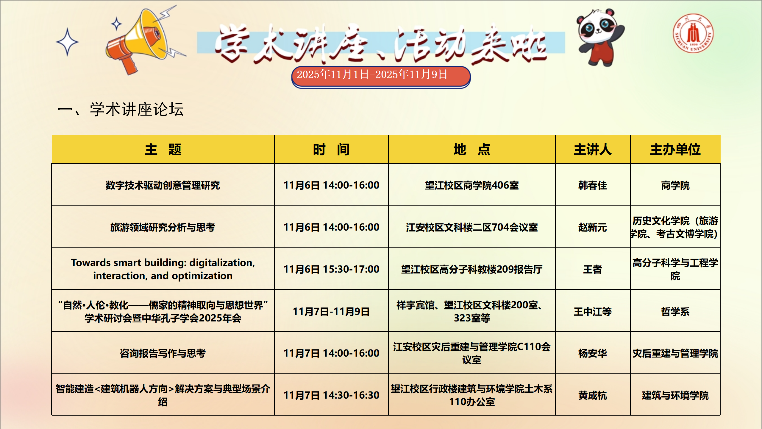 学术讲座和校园文化活动预告(2025年11月1日-2025年11月9日)