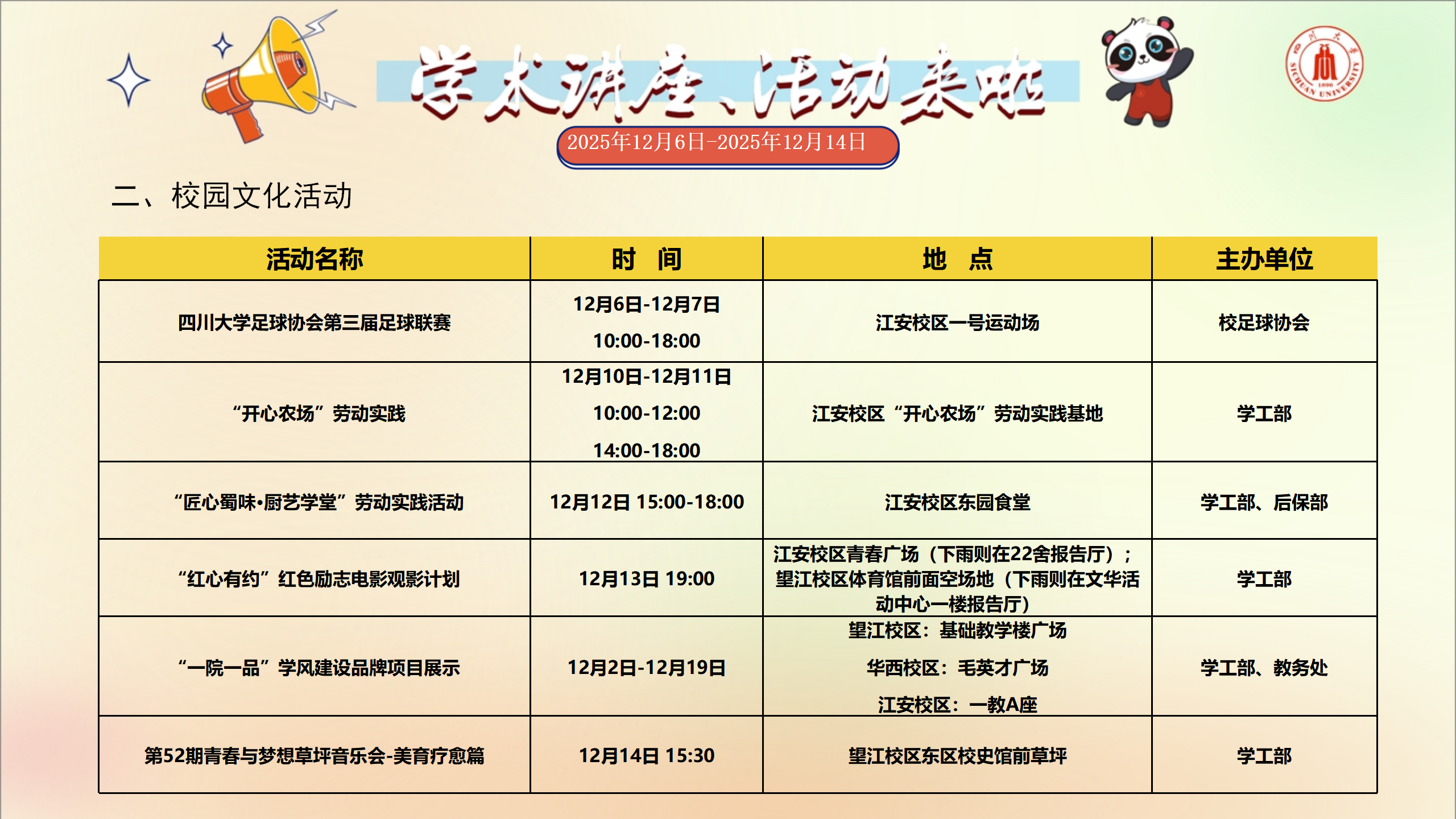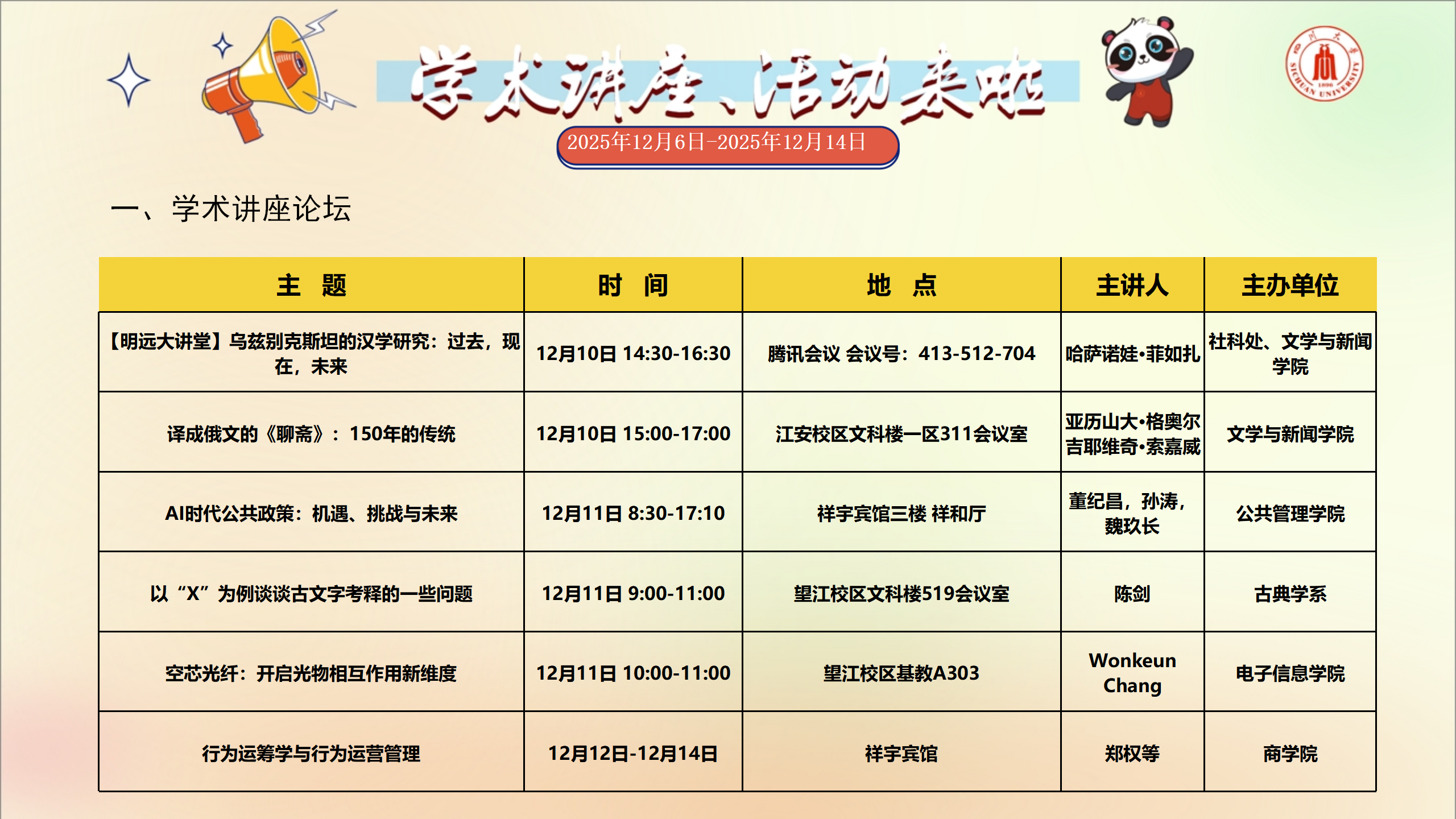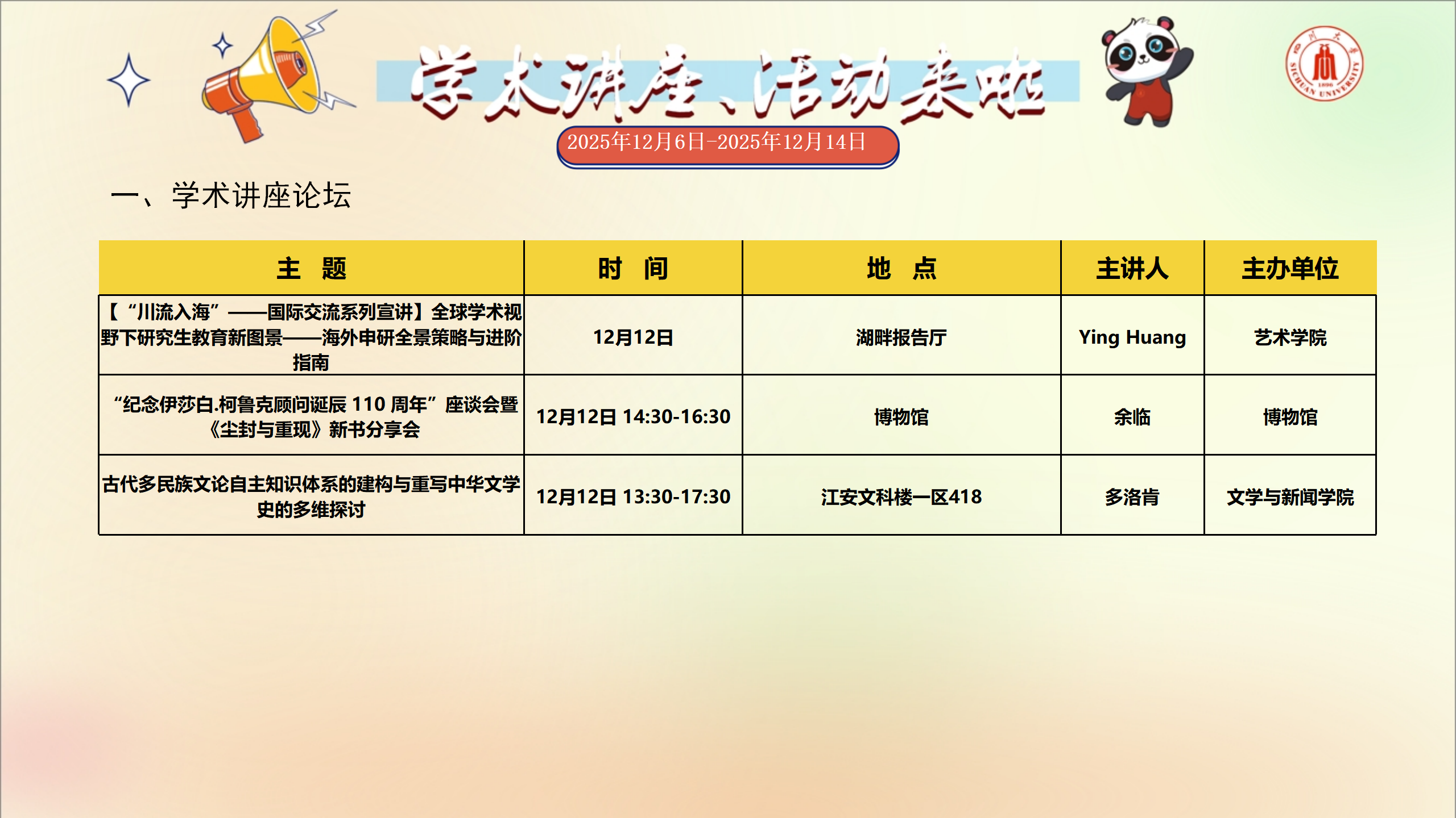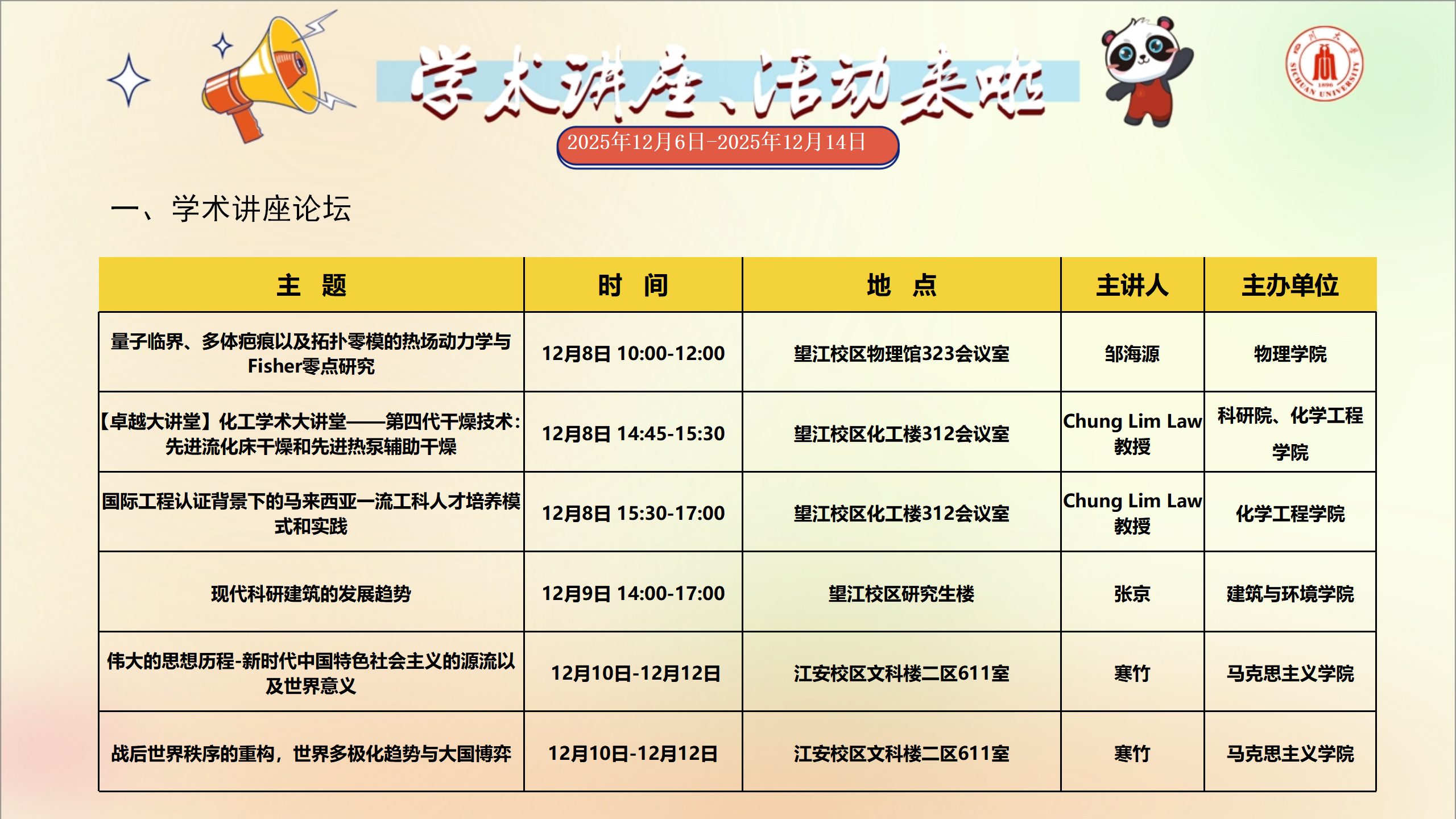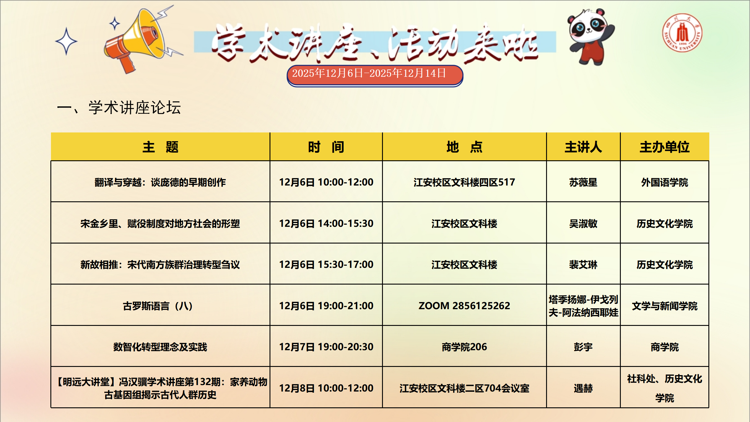 学术讲座和校园文化活动预告(2025年12月6日-2025年12月14日)