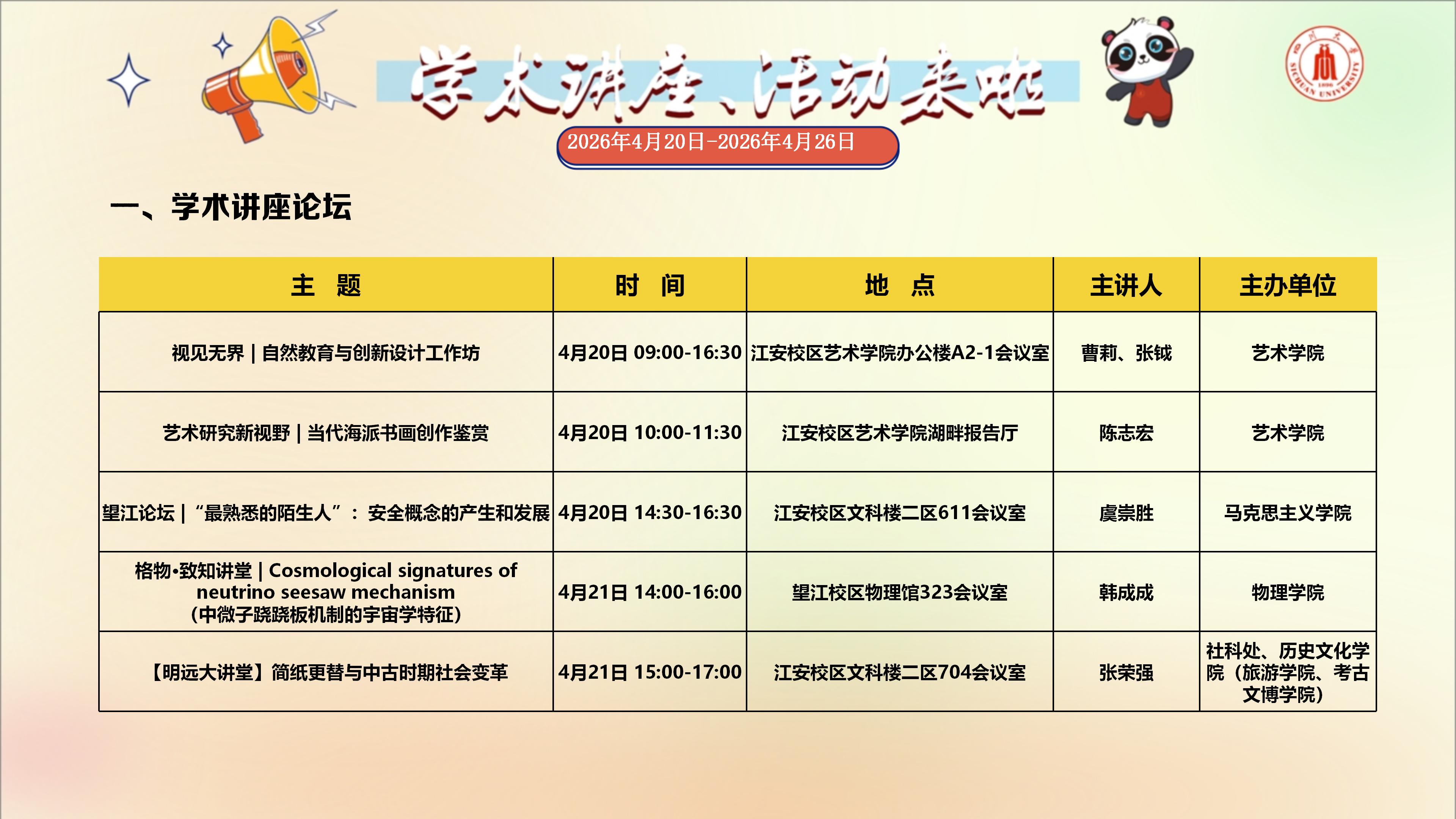 学术讲座与校园文化活动预告(2026年4月20日-2026年4月26日)